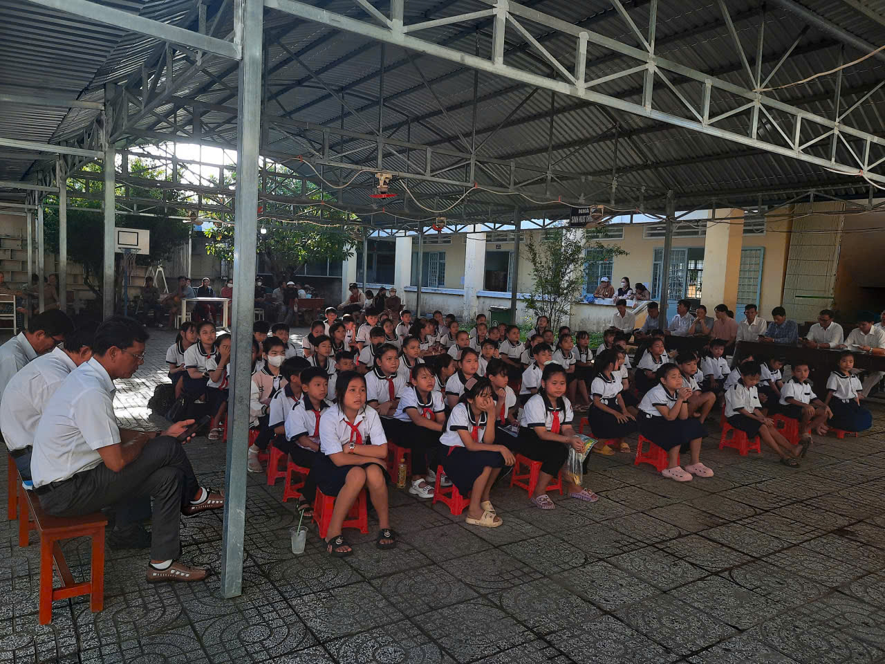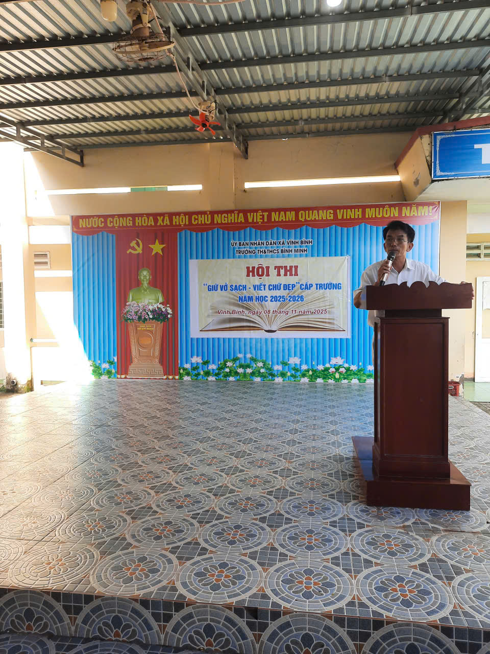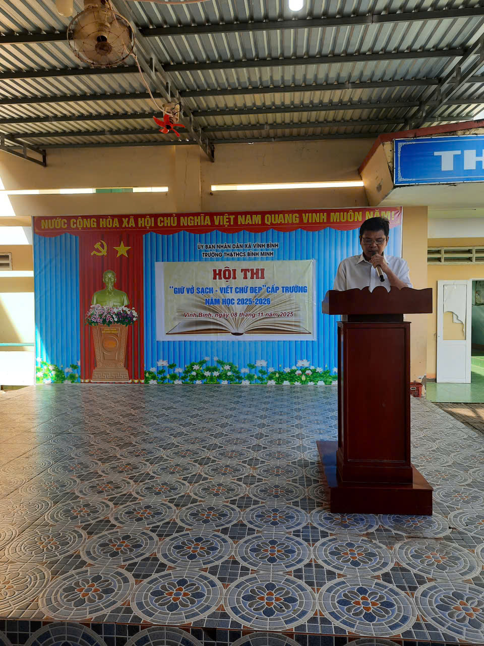 Thầy Đỗ Quốc Bình – Hiệu trưởng, chủ tịch hội đồng tổ chức hội thi lên khai mạc hội thi “Giữ vở sạch – Viết chữ đẹp” cấp trường năm học 2025-2026.