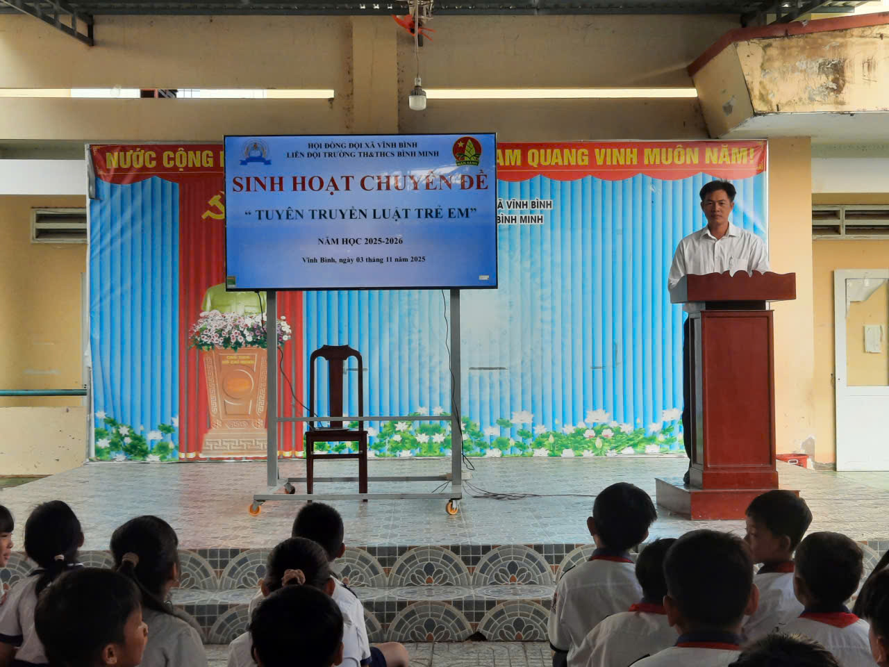 Hôm nay ngày 03/11/2025 Liên đội Trường TH&THCS Bình Minh tổ chức hoạt động: “Tuyên truyền luật trẻ em và quyền tham gia của trẻ em”. Đến tham dự buổi tuyên truyền có 10 chi đội với 352 em học sinh là Đội viên và Sao nhi đồng cùng quý thầy cô là lãnh đạo, quý thầy cô là giáo viên chủ nhiệm các lớp tham gia.